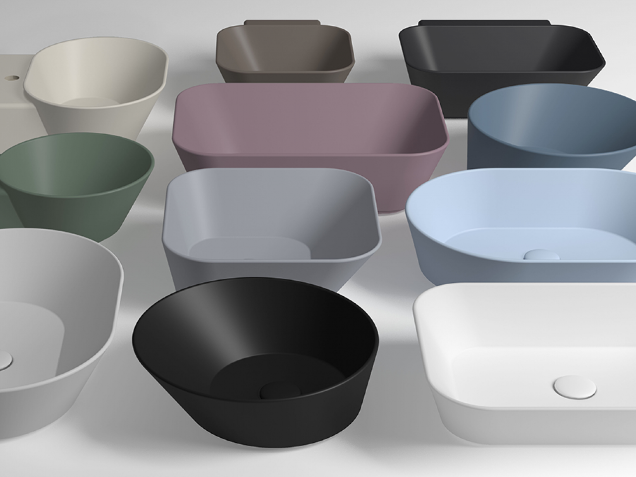 Круглые, овальные, квадратные, прямоугольные, настольные или настенные умывальники коллекции WAVE с тонким ободом 8 мм доступны в 13 цветах: белом и черном глянце, а также в матовых цветах: белый, черный, антрацит, бежевый, цемент, зеркало, мокка, мирт, морской, песочный и темно-розовый. Комплектующие и аксессуары выпускаются в керамике того же цвета.